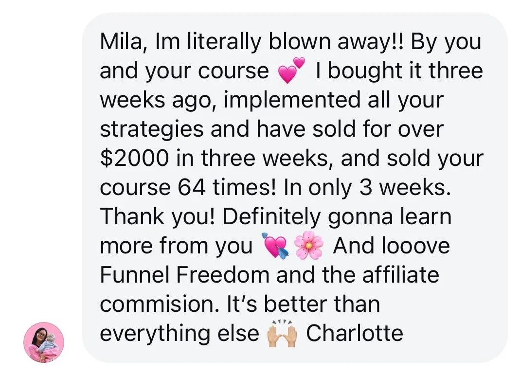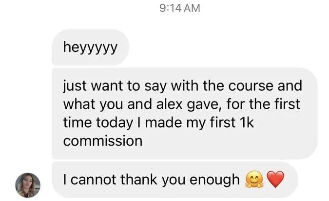"Mila introduced me to digital marketing nearly 2 years ago! She’s been helpful from the very beginning. Before I knew absolutely NOTHING about making money online but with her help I have made $2.5 million in commissions…something I never could have even dreamt of. She is an OG in this industry and the success she’s had wasn’t by luck. It was by hard work and strategy and I will never stop appreciating the help and advice she’s given me throughout this journey."
